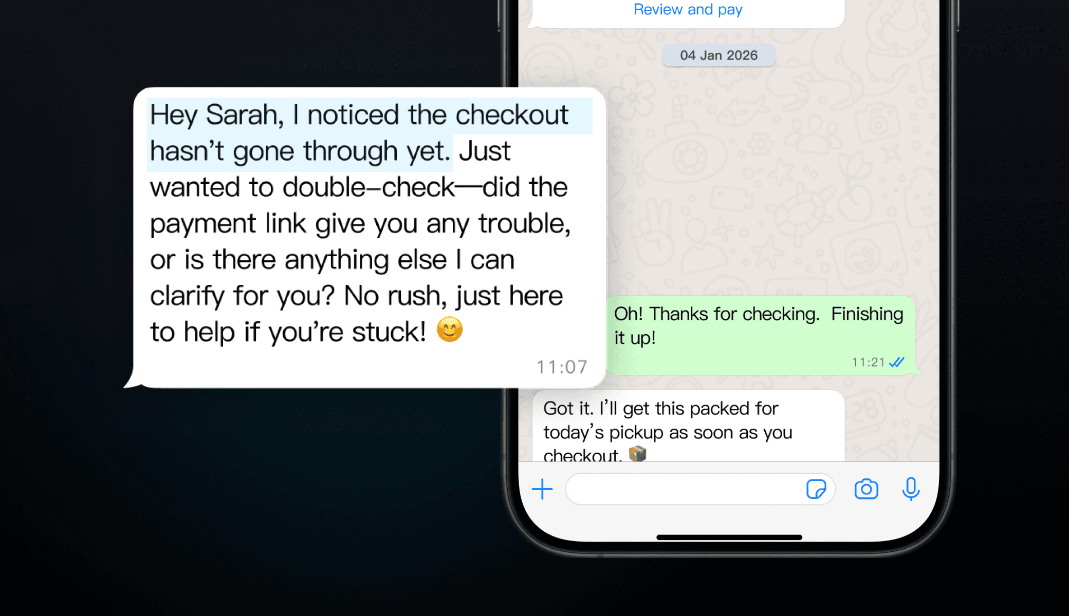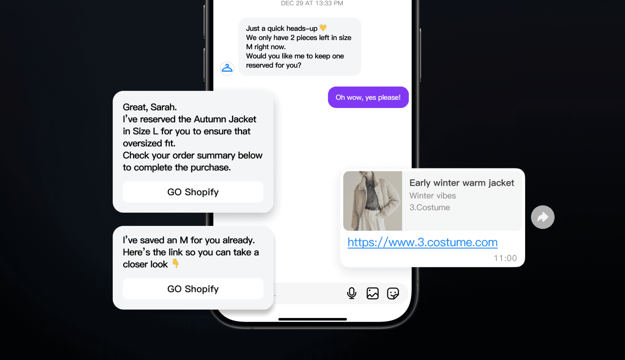 Deliver checkout links directly from Shopify to complete the sale in-chat.